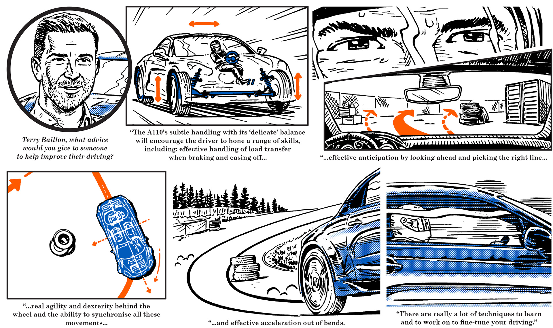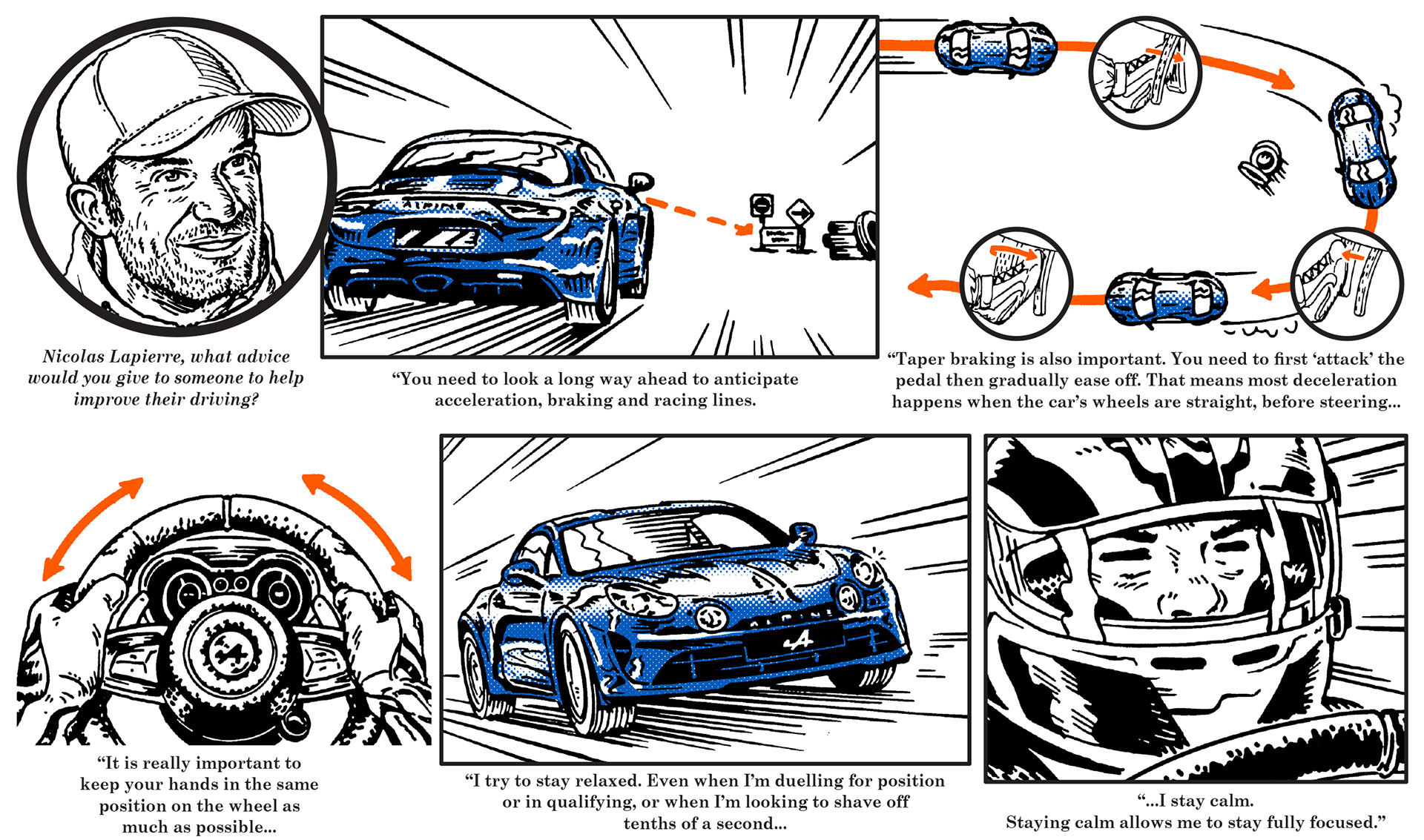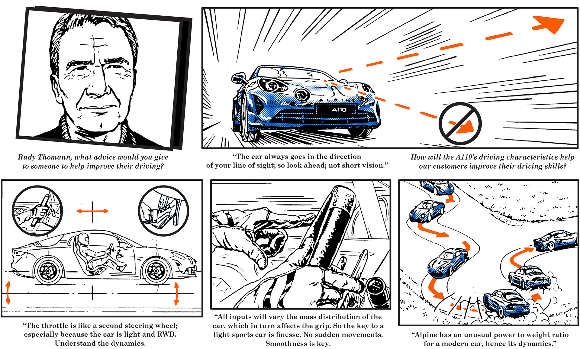 In July, 2018, I illustrated the driving tips of four test drivers and professionals for the new European car maker Alpine.